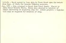 The Courier's homeport remained the Reserve Training Center in Yorktown and she finished her Coast Guard career as a training vessel for reservists.[5] She carried accommodations for 220 trainees, patrol boats, and communication equipment. Her small boats were used to train reservists in harbor patrols while her cargo handling equipment was employed to train reservists in handling dangerous cargoes.[3]