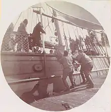Bear was built in 1874 as a sealer at Dundee, Scotland shipyards. Custom-built for sealing out of St. John's, Newfoundland, Bear was the most outstanding sealing vessel of her day, the lead ship in a new generation of sealers.[5] Heavy-built with six-inch (15.2 cm) thick wooden planks, Bear was rigged as a sailing barquentine but her main power was a steam engine designed to smash deep into ice packs to reach seal herds. At the time of her arrival in St. John's, there were 300 vessels outfitted each season to hunt seals, but most were small schooners or old sailing barques.[6] The new sealing ships represented by Bear radically transformed the Eastern North Atlantic seal fishery as they replaced the hundreds of smaller sealing vessels owned by merchants in outports around Newfoundland with large and expensive steamships owned by large British and Newfoundland companies based in St. John's.[7] Owned at first by the Scottish firm W. Grieve and Sons, she was acquired in 1880 by R. Steele Junior.[8] Bear spent a decade sealing from St. John. In 1884, the Steeles sent Bear back to Scotland for a refit.