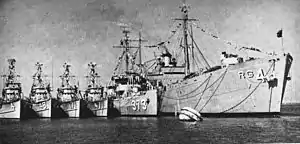 ![]() Right to left: Tutuila (ARG 4), Peregrine (AM 373), Fulmar (AMS 47), Hawk (AMS 17), Lapwing, and Cardinal (AMS 4) | |