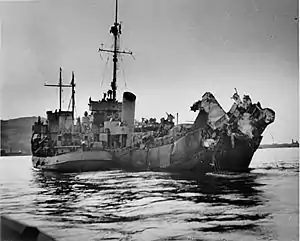 On 3 May 1944, Menges was 15½ miles astern of the convoy chasing down a radar contact when she was hit at 0118 hours by a G7es acoustic torpedo from U-371 (which was in turn sunk the next day by USS Joseph E. Campbell, USS Pride and other warships). The explosion was so violent that the aft third of the ship was destroyed, killing 31 men and wounding 25. However, Commander McCabe refused to give the order to abandon ship as long as there was chance of saving her. In addition, several of the crew members heroically jumped astride torpedoes loosened in the blast to disarm them. Menges, thanks to such creditable action, remained afloat.