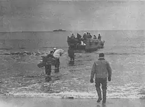 On 8 June 1945, Mobjack steamed to Samar to stage for the landings at Balikpapan on Borneo. Departing on 21 June 1945, she moved, with MTBRons 10 and 27, to Basilan Island, thence, on 26 June 1945, further down the Sulu Archipelago and into Makassar Strait. On 27 June 1945, she joined the minesweepers, at work since 1 June 1945, and the ships of the bombardment group, which had been pounding the Japanese-held oil center since 17 June 1945, in preparing the way for the Australian assault force. For four days Mobjack fueled and sustained the motor torpedo boats assigned to night patrol off the coast to prevent the Japanese from replacing naval mines, restoring obstacles blown by underwater demolition teams, or disturbing channel markers planted by the minesweepers. On 1 July 1945, these extensive preparations and precautions proved to have been well executed as wave after wave of personnel of the Australian 7th Division of the Australian I Corps went ashore without a casualty.[1]