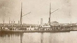 While this was going on, the United States was negotiating with Great Britain over compensation for losses inflicted by British ships knowingly sold to the Confederacy during the Civil War (the Alabama Claims). Peru had been involved in an undeclared war with Spain (the Chincha Islands War) in 1864–66 and the US was not willing to prejudice its claims against the United Kingdom by performing a similar action for a belligerent power.[13] Negotiations over the issue delayed the departure of the two monitors until January 1869, after Peru bought two steamers, Reyes and Marañon to tow the monitors. They only reached Pensacola, Florida, before machinery breakdowns forced them to wait 30 days for repairs to be completed. En route from Key West to the Bahamas, the ships were separated in heavy weather. When Reyes attempted to reattach her towrope after the storm moderated, she collided with the sharp bow of Manco Cápac and sank in 15 minutes. The monitor, short of coal and food, was forced to make port at Naranjo, Cuba, then held by rebels against the Spanish government. They allowed the ship to restock her supplies, but no coal was available so the crew loaded up enough wood to reach the Bahamas where they were able to send a local schooner to Nassau to inform the authorities of their plight. The ships finally reunited at St. Thomas in the Virgin Islands and had to wait for the Pachitea to arrive from Peru to tow Manco Cápac. While entering Rio de Janeiro on the night of 15 September, Manco Cápac ran aground; she was refloated the following day, but the damage required three months to repair. The ships were joined by the steam corvette Unión during this time. They reached the Strait of Magellan on 29 January 1870 and Callao on 11 May.[14]