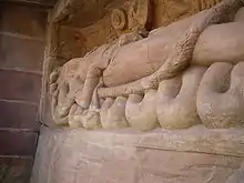 The sanctum door is flanked by guardians. Beside them, on either side, are figures of Vishnu and of Shiva Gangadhara. The cave also has Durga slaying Mahishasura – the deceptive shape-shifting buffalo demon. This is one of the earliest representations of this Durga legend in a cave temple.[52][note 10] Of special note also is the figure of seated Ganesha in this cave, to the left of the entrance, and the rectangular niche with seated goddesses, located to the right. The Ganesha is potbellied, has modaka (laddu or rice balls, sweetmeat) in his left hand and his trunk is reaching out to get one.[54][note 11] This makes the cave notable as it sets the floruit for the widespread acceptance and significance of Ganesha in the Hindu pantheon to about 401 CE. The presence of all three major traditions within the same temple is also significant and it presages the norm for temple space in subsequent centuries.[55]