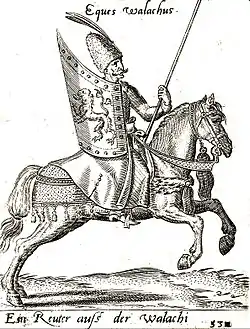 For a while in 1599, Băleanu may have sided with dissident boyars, asking for Simion Movilă, brother of the Moldavian Prince Ieremia Movilă, to take the Wallachian throne from Prince Michael.[13] In autumn of the same year, however, he resumed his activity as Michael's general: Michael led the main Wallachian thrust into Transylvania, while Băleanu and Radu Buzescu led a supporting march from Oltenia.[14] Their force, also comprising hajduk irregulars under the command of Starina Novak, climbed up the Olt River by way of Rothenturm, joining up with Michael's forces before the Wallachian victory at Șelimbăr.[15] According to scholar Octav-George Lecca, Băleanu may have also been designated as governor of Muntenia while Buzescu took over the administration of Oltenia.[16]