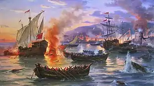 The Ukrainian Naval Forces trace their history to the Zaporizhian Sich Cossacks, who would frequently raid Ottoman settlements along the Black Sea coast. Cossacks used small ships called "chaikas" which were similar in design to Viking long ships. Although technologically inferior to the Turks the Cossacks had great success against their opponent. In 1614 the Cossack forces were able to raid, and destroy Trabzon. In 1615 the Cossacks were able to mount a raid on Istanbul itself, destroying several suburbs of the city. In 1616 a Cossack fleet was able to reach the Bosphorus, once again raiding the surrounding countryside. A Turkish fleet sent to destroy the Cossack forces was defeated in 1617. The Cossacks once again managed to mount an attack on Istanbul in 1625, forcing the Sultan to temporarily flee the capital. The Cossacks used several strategies to attack the larger Ottoman forces, such as positioning their ships during battle in a way that sun was always at their back. The Cossack ships were small with a low profile, making them hard to hit by cannon. Cossacks were typically armed with small arm muskets, and during battle had the goal of killing the crew and boarding the ship to take it over, rather than sinking the ship.[14]