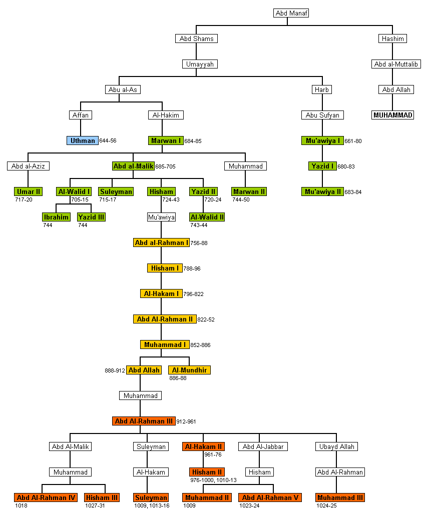 Two of the sons of Abu al-As, Affan and al-Hakam, each fathered future caliphs, Uthman and Marwan I, respectively.[4] From the latter's descendants, known as the Marwanids, came the Umayyad caliphs of Damascus who reigned successively between 684 and 750, and then the Cordoba-based emirs and caliphs of al-Andalus (Muslim Spain), who held office until 1031.[4] Other than those who had escaped to al-Andalus, most of the Marwanids were killed in the Abbasid purges of 750. However, a number of them settled in Egypt and Iran, where one of them, Abu al-Faraj al-Isfahani, authored the famous source of Arab history, the Kitab al-Aghani.[4] Uthman, the third Rashidun caliph, who ruled between 644 and 656, left several descendants, some of whom served political posts under the Umayyad caliphs.[4] From the Abu al-Is line came the politically important family of Asid ibn Abi al-Is, whose members served military and gubernatorial posts under various Rashidun and Umayyad caliphs.[4] The al-As line, meanwhile, produced Sa'id ibn al-As, who served as one of Uthman's governors in Kufa.[4]