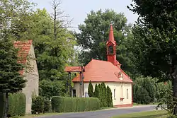 Typical for the region, the German name of the village derives from the name of the Lokator who brought German farmers to the village which was a typical Waldhufendorf.[2]