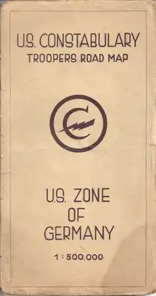 The uniform of the Constabulary trooper was designed both to make him easily recognizable and to distinguish him as a member of an elite force. The "Lightning Bolt" shoulder patch consisting of a circular yellow shoulder patch with the border of the patch and the letter "C" in the middle being in blue. A red lightning bolt appeared diagonally angled downward from right to left in the center of the "C". The yellow, blue, and red combined the colors of the cavalry, infantry, and artillery. Their motto was "Mobility, Vigilance, Justice." To make the troops more distinctive they were given US Cavalry bright golden yellow scarves, combat boots with a smooth outer surface designed to be spit shined, and helmet liners bearing the Constabulary insignia and yellow and blue stripes.[1] One ex-member of the force remembered being called a "circle C cowboy" by soldiers from American regular army units.