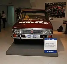 The VAZ-2103 Zhiguli is a deluxe compact sedan car (small class, passenger car, model 3 in the Soviet classification), produced by VAZ, introduced in 1972 and produced until 1984. Better known by its export name Lada 1500 outside of its native Soviet Union and popularly nicknamed Тройка (Troika, 'three') in its domestic market. The car was developed jointly by VAZ and FIAT at the same time as Fiat 124 Special, and the two models had the same basis and influenced each other.[2][3] 2103 was built under license and tailored for the Soviet and Eastern European market. The 2103 externally differs from its predecessor, the VAZ-2101 firstly by its four, that is, double sets of headlights, different grille and direction pointers, moldings on the sides of the body and larger taillights. Its main difference - the more powerful 75 hp (56 kW; 76 PS) 1,452 cc (88.6 cu in) straight four petrol engine.[4] In addition, this model is distinguished by the presence of vacuum brake booster as well as self-adjusting rear brakes and internally on new, Fiat 125 based, front panel along with its steering wheel and improved dashboard featuring wood imitation, tachometer, oil pressure gauge and front panel clock. [5]