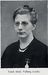 Valborg Lerche (16 April 1873 – 7 March 1931) was a Norwegian social worker. She was the first female theologian in Norway.