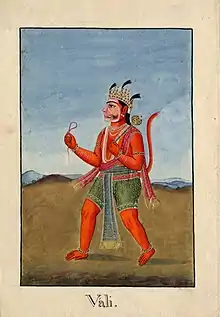 Vaali (Sanskrit: वाली, nominative singular of the root वालिन् (Valin), also known as Bali, was king of Kishkindha in the Hindu epic Ramayan. He was the husband of Tara, spiritual son of Indra, biological son of Vriksharaja, the elder brother of Sugreeva and father of Angada. He was killed by Rama, an avatar of Vishnu. Vaali was invincible during Treta Yuga. Vaali defeated some of the greatest warriors like Ravana. Vaali was blessed with the ability to obtain half the strength of his opponent. Rama killed Vaali by hiding behind the trees. However, during first attempt, Rama could not recognize which one is Vaali and which Sugriva due to their similar looks. Thus, during the next attempt, Sugriva wore a garland of red flowers and went to battle with Vaali. This time, Lord Rama could recognize which was Vaali and shot an arrow that killed him.[1]