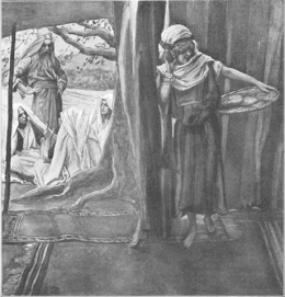 The Gemara noted that in Genesis 18:6, Abraham directed Sarah to take flour, "knead it, and make cakes upon the hearth," but then Genesis 18:8 reports, "And he took butter and milk, and the calf," without reporting that Abraham brought any bread to his guests. Ephraim Maksha'ah, a disciple of Rabbi Meir, said in his teacher's name that Abraham ate even unconsecrated food (chullin) only when it was ritually pure, and that day Sarah had her menstrual period (and so the bread that she baked was ritually impure by virtue of this phenomenon that reflected the rejuvenation that was to make the birth of Isaac possible).[123] Similarly, the Pirke de Rabbi Eliezer taught that when the three angels visited Abraham, Abraham ran to meet them and prepare for them a great banquet. He told Sarah to prepare cakes for them, but when Sarah was kneading, she perceived that the manner of women was upon her, so Abraham did not serve his visitors any of the cakes. Rather, Abraham ran to fetch a calf, but the calf fled from him and went into the cave of Machpelah. Abraham chased in after the calf, and found Adam and Eve lying there upon their beds. Lights were kindled above them, and a sweet scent was upon them. Abraham consequently sought to get the cave as a burial possession, as Genesis 23 reports.[182]