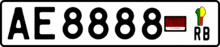 License plates of Benin are made with European shape and size. The current scheme of regular license plates for private vehicles of Benin introduced in the early 1990s. It has the format A1234, later AB1234 where AB - Series 1234 - number. Regular plates have a white background with black signs. At the right side of the plate are image maps of the country in the colors of the national flag under which the code has RB. Between the main group symbols and code placed rectangular sticker. There is a two-line version of the format license plate AB / 1234. License plate for motorcycles format is 1A / 2345, where 1A - Series, 2345 - number. Regional coding is missing.