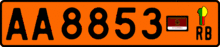 Commercial vehicles have license plates with red symbols on an orange background. Format registration marks are similar to regular. At the right side of the plate are image maps of the country in the colors of the national flag under which the code has RB. Between the main group symbols and code placed rectangular sticker.