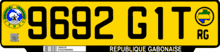 By 2013, issued license plates 1234G5A format, which 1234 - number, G - pointer Gabon, 5 - a region code A - series. Regular plates had a yellow background with black marks. In the upper left corner of the plate was placed emblem Central African economic and Monetary Community (SEMAS) in the right side of the plate in the disk image was located a map of the country in the colors of the national flag under which the code was situated RG.