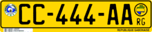 The current scheme of regular license plates Gabon introduced in 2013. This scheme copies the French SIV scheme of 2009 and has the format AS-123-SH, where AB-SH - Series 123 - Number. Regular plates have black letters and numbers on a yellow background. In the upper left corner of the plate are the emblem of the Central African economic and Monetary Community (SEMAS) in the right side of the plate in terms of image maps are the country's national flag colors under which the code has RG. Regional coding is missing.[1]