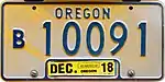 For-Rent | Blue on gold; "OREGON" at top and "DEC." and year of expiration at bottom | F/R 1-2345 | Issued to trailers having a loaded weight of 8,000 lb or less that are for hire and are equipped with pneumatic tires. All plates expire on December 31 of the stated year. | ||