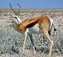 Much of the interior of Southern Africa consists of a high plateau, the higher portions 1,500–2,100 m (4,900–6,900 ft) of which are known as the Highveld, starting at the Drakensberg escarpment, 220 km (140 mi) to the east of Johannesburg and sloping gradually downwards to the west and south west, as well as to the north, through the Bushveld towards the Limpopo river.[7] These higher, cooler areas (generally more than 1,500 metres or 4,900 feet above sea level) are characterised by flat or gently undulating terrain, vast grasslands and a modified tropical or subtropical climate. To the east, the Highveld's border is marked by the Great Escarpment, or the Mpumalanga Drakensberg, but in the other directions the boundary is not obvious and often arbitrary. The blesbok and quagga were among the large animals that once roamed on the highveld in great numbers. Nowadays there still is a sizeable population of springbok in some areas,[8] though much of the area is devoted to commercial farming and South Africa's largest conurbation (Gauteng Province).