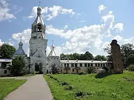 The city is known for the variety and age of its medieval monuments. The foremost among these is the St. Sophia Cathedral, built between 1045 and 1050 under the patronage of Vladimir Yaroslavich, the son of Yaroslav the Wise; Vladimir and his mother, Anna Porphyrogenita, are buried in the cathedral.[37] It is one of the best preserved churches from the 11th century. It is also probably the oldest structure still in use in Russia and the first one to represent original features of Russian architecture (austere stone walls, five helmet-like domes). Its frescoes were painted in the 12th century originally on the orders of Bishop Nikita (died 1108) (the "porches" or side chapels were painted in 1144 under Archbishop Nifont) and renovated several times over the centuries, most recently in the nineteenth century.[38] The cathedral features famous bronze gates, which now hang in the west entrance, allegedly made in Magdeburg in 1156 (other sources see them originating from Płock in Poland) and reportedly snatched by Novgorodians from the Swedish town of Sigtuna in 1187. More recent scholarship has determined that the gates were most likely purchased in the mid-15th century, apparently at the behest of Archbishop Euthymius II (1429–1458), a lover of Western art and architectural styles.[39]