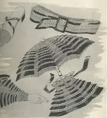 A constant desire to explore and innovate permeated Vera Borea's work. She figured out how to weather-proof corduroy and used it for a raincoat. Another raincoat was made of rubber. She spun hemp with silk for travel suits[40] and introduced in France the two-way-stretch elastic fabrics.[41] An evening coat was made of transparent fabric. An aviator jacket was made of supple leather and a knitted back panel, making it wearable both indoors and outdoors. Shoes sported heels made of rubber. Buttons were made of Brazil nuts. Other elements like fur, raffia, rope, bone, nut, feathers, pine cones and leather also showed up in her designs.[42][43]