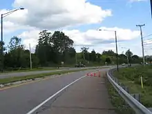Midway between Essex Way and the riverbank, several unused ramps intended for an interchange with Allen Martin Parkway extend outward from VT 289.[1][3] The highway continues south to the Winooski River, where it terminates at a partial interchange with VT 117 east of Essex Junction.[3] VT 289 is the only road in Vermont to have mile-based exit numbering.