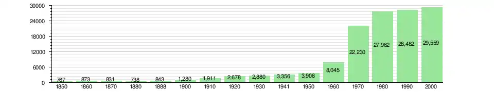 Vernier has a population (as of December 2019) of 34,958.[6] As of 2008, 43.8% of the population are resident foreign nationals.[7] Over the last 10 years (1999–2009 ) the population has changed at a rate of 13.2%. It has changed at a rate of 6.3% due to migration and at a rate of 7.1% due to births and deaths.[8]