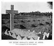 Sir Victor was commissioned in the Territorial Army in 1910 as captain in the 3rd London General Hospital of the Royal Army Medical Corps.[11] On the outbreak of the First World War, he requested for active duty on the Western Front where he was initially sent as surgeon at the British hospital at Wimereux, France.[7] He was next posted in May 1915 as a colonel and Director of Surgery of the British Army Medical Service in Egypt, based at the 21st General Hospital in Alexandria, in support of the Dardanelles Campaign.[6] In the following year he volunteered for field surgery duty in Mesopotamia, where he died unexpectedly in Amarah, Iraq, on 16 July 1916, of heatstroke and severe hyperpyrexia, at only 59 years of age.