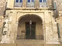 The villa is found just outside the outskirts[34] and suburb[35] of Valletta in the hamlet of Guardamangia[36] set just at the crest[37] in a quiet residential area[38] in a narrow street.[39] The villa is described as built in the form of a palace complemented with sea views over Marsamxett Harbour.[40] The Queen describes it as a "town house".[10] It is a typical traditional Maltese residence.[9] The building is built with limestone, known as sandstone and described by the Queen as "yellow stone",[10] and designed with spacious interiors.[41] The house has two entrances with one set at street level and another set after going up a flight of stairs under an elaborate front porch.[10] The royal family had taken their own personal belongings from Britain when they lived at the villa[42] allowing them to live in a lavish residence,[43] in a once-elegant home.[35] The royal family had British servants at the villa.[44]