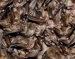 White-nose syndrome is one of the worst wildlife diseases in recent history that is currently decimating North American cave-hibernating bat populations.[25] This epidemic is responsible for mass mortalities in hibernating North American bats, and is caused by a uniquely cold-adapted fungus Pseudogymnoascus destructans. The fungus begins to grow on bats during the winter hibernation season, when bats are in torpor and immune-compromised. The body temperature of a hibernating bat is the optimal fungal growth environment.[25] The fungus has affected 90% of species that hibernate in caves for the winter. Pseudogymnoascus destructans spores have been found growing on the Virginia big-eared bat. To date, no WNS mortality in this species has been observed although the syndrome has killed millions of its fellow cave-dwelling species.[26] It is currently thought that the Big Ears may have a natural immunity to WNS through a yeast that the bat 'combs' over their body that inhibits the growth of the WNS fungus.[27]