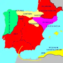 ![]() Greatest extent of the Visigothic Kingdom, c. 500 (Total extension shown in orange. Territory lost after Battle of Vouillé shown in light orange). | |||||||||||||||