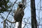 Its pelage is usually creamy white, with tinges of yellow-gold, silver grey or pale brown on the neck, shoulders, back and limbs. The face is entirely black.[4] Group size is between 2 and 10 individuals, with groups of 3 to 6 most common.[4]