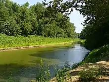 At mile forty-five, the river becomes straighter with few sharp bends. An additional seventeen tributaries raise the depth of the river considerably making it navigable for larger vessels.[13] At mile fifty-nine, the river passes through Ouabache State Park where it begins to widen and become more shallow. The white limestone river bottom can sometimes be seen in the area, whereas it is not visible due to pollution elsewhere downstream.[13] As the river exits the park and flows towards the city of Bluffton near mile sixty-six, it widens further, becoming more shallow; only a narrow channel is navigable by larger vessels. The river remains shallow and somewhat rocky with minor rapids until mile seventy-one near the community of Murray.[14] There the river becomes calm and deeper until mile eighty-one due to the dam and levee at the town of Markle. The lock that was formerly at the site is abandoned and a narrow washout is the only means to bypass the dam. In the rocky washout the river level drops four feet, making it one of the most dangerous points on the river. Boaters are advised to exit the river and reembark on the other side of the dam rather than traverse the washout.[15]