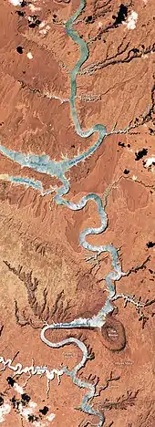 The Castle Rock Cut is one of the most important navigational channels in the lake; it was blasted as early as the 1970s to allow boaters to bypass the winding canyons between the Glen Canyon Dam and reaches of Lake Powell further upstream – saving, on average, one hour of travel time. The cut has been deepened several times since then, to allow the use of the channel during droughts.[14] During the protracted 21st century drought, however, the lake has dropped so quickly on several occasions that the cut dried up during the summer tourist season, most recently in 2013. Continued deepening of the Castle Rock cut has been criticized for its high cost, but boaters and the National Park Service argue that it improves safety, saves millions of dollars in fuel, and improves emergency response time.[15]