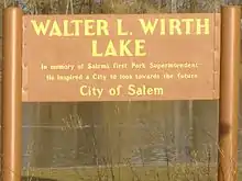 Walter Wirth Lake (aka Lake Wirth) is a lake in Salem, Oregon, United States. Walter Wirth Lake is wholly contained within Cascades Gateway Park. The park and lake began development in 1957 with the Salem Area Chamber of Commerce working with the State Highway Department to convert a gravel burrow pit into a park. Original development of the park included a swimming area, paddle boats, a children's zoo, and concession stands. In 1976, a Department of Environmental Quality study determined the lake to be suffering the effects from upstream polluters closing the lake to swimming. Since that time the lake has held numerous programs in canoeing, sailing, and fishing, it is now open for swimming again.[1]