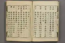 The Wamyō ruijushō, survives in both a 10-volume edition (十巻本) and a 20-volume edition (二十巻本). The larger one was published in 1617 with a commentary by Nawa Dōen (那波道円, 1595–1648) and was used in the Edo period until the 1883 publication of the 10-volume edition annotated by Kariya Ekisai (狩谷棭齋, 1775–1835), also known as the Senchū Wamyō ruijushō (箋注倭名類聚抄 "Annotated commentary to the Wamyō ruijushō"). The 10-volume edition has 24 main headings divided into a total of 128 subheadings, while the 20-volume version has 32 and 249, respectively. The table below illustrates how words are semantically categorized in the 10-volume edition.