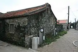 Jhongshe, Wangan Township, Penghu County{...}In 1971, the late president Chiang Ching-kuo visited the flower house, and seeing that it sits in the middle of four other villages in Wang an Township, renamed it “Jhongshe” (the village in the middle).{...}The architecture style of the historical houses in Jhongshe Village is called “one stamp” style sanheyuan.