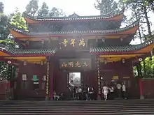 Wannian Temple (simplified Chinese: 万年寺; traditional Chinese: 萬年寺; pinyin: Wànnián Sì; lit. 'Ten Thousand Year Temple') is a Buddhist temple located at the foot of Camel Mountain Range of Mount Emei, in Emeishan City, Sichuan, China.[1] It is one of the six earliest Buddhist temples on Mount Emei. The temple is situated at the foot of Camel Mountain Range, facing the Daping Temple (大坪寺; 'Flat Ground Temple'), Niuxin Temple (牛心寺; 'Cattle Heart Temple'), Shisun Summit (石笋峰; 'Stalagmite Summit') and Bomeng Summit (钵孟峰) in the front. Wannian Temple is known not only for the bronze statue of Samantabhadra, but also for the Beamless Brick Hall.[2]