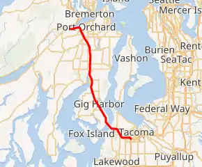 State Route 16 (SR 16) is a 27.16-mile-long (43.71 km) state highway in the U.S. state of Washington, connecting Pierce and Kitsap counties. The highway, signed as east–west, begins at an interchange with Interstate 5 (I-5) in Tacoma and travels through the city as a freeway towards the Tacoma Narrows. SR 16 crosses the narrows onto the Kitsap Peninsula on the partially tolled Tacoma Narrows Bridge and continues through Gig Harbor and Port Orchard before the freeway ends in Gorst. The designation ends at an intersection with SR 3 southwest of the beginning of its freeway through Bremerton and Poulsbo. SR 16 is designated as a Strategic Highway Network (STRAHNET) corridor within the National Highway System as the main thoroughfare connecting Tacoma to Naval Base Kitsap and a part of the Highways of Statewide Significance program.