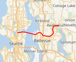 State Route 520 (SR 520) is a state highway and freeway in the Seattle metropolitan area, part of the U.S. state of Washington. It runs 13 miles (21 km) from Seattle in the west to Redmond in the east. The freeway connects Seattle to the Eastside region of King County via the Evergreen Point Floating Bridge on Lake Washington. SR 520 intersects several state highways, including Interstate 5 (I-5) in Seattle, I-405 in Bellevue, and SR 202 in Redmond.