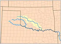 The Washita River forms in eastern Roberts County, Texas (35°38′N 100°36′W), near the town of Miami in the Texas Panhandle. The river crosses Hemphill County, Texas and enters Oklahoma in Roger Mills County. It cuts through the Oklahoma counties of Roger Mills, Custer, Washita, Caddo, Grady, Garvin, Murray, Carter, and Johnston before emptying into Lake Texoma, which is the modern border between Bryan County and Marshall County.[3]