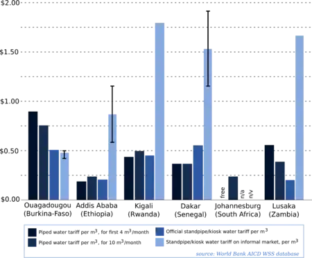 There is an overall underpricing of formal water and sanitation services in Sub-Saharan Africa.[7][11] A first consequence is an insufficient cost recovery, leading to dependency on foreign aid and governmental support, and to insufficient investments. Second, underpricing is socially unfair. Since the poorest social groups are less connected to water networks and sewerage, they need to turn to alternatives, and they pay in some cases a multiple of the formal tariff. Hence, the poorest are hit twice: they have less access to improved water supply and sanitation, and they need to pay more.