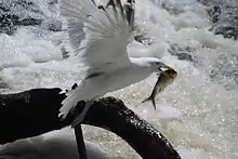 Today, a fish ladder provides access to upstream spawning habitat as part of a system of fish passages that provide access up to river mile 20.[5] The high concentrations of blueback herring and alewife below the dam in the spring make it a popular fishing spot for herring gulls, great black-backed gulls, great blue herons, night herons and cormorants.