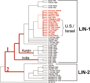 The virus was discovered in Uganda in 1937 and was first detected in Morocco in 1996, Italy in 1998, Israel in 1998, and North America in 1999,[49][51] with the New York strain linked to that from Israel and surrounding countries.[55]