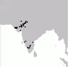 This species was discovered in the Eastern Ghats near Nellore by T C Jerdon who received a specimen from a local hunter.[8] A specimen was later obtained in 1863 from near Bangalore and for a long time the species was not observed anywhere in southern India. A O Hume had suggested in that the two populations might represent different species.[5] The southern population was subsequently noted when Salim Ali collected specimens from the Biligirirangan Hills. The species occurs in the nearby Kaveri valley area where Parus cinereus stupae is also found. The species has also been reported from the Chittoor district of Andhra Pradesh.[9] Salim Ali had claimed that the two species were mutually exclusive, however there is no support for this.[10][11] The distribution in western India is larger and better known, ranging mainly in areas of Kutch and extending into parts of Rajasthan and Haryana.[12] A specimen in the British Museum marked as being from Bootan (Bhutan) is considered to be in error.[6][13] Records from Wynaad, Anshi National Park and Dharwad have also been considered doubtful.[11]
