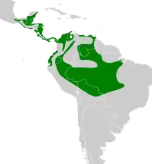 It is found in forest and woodland from southern Mexico through Central America to the Chocó, northern Colombia (including Magdalena Valley), northern Venezuela, and the western and southern Amazon Basin.