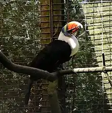 The white-throated toucan (Ramphastos tucanus) is a near-passerine bird in the family Ramphastidae found in South America throughout the Amazon Basin including the adjacent Tocantins and Araguaia River drainage. It prefers tropical humid forest, but also occurs in woodland and locally in riverine forest within cerrado. This bird can be found in Bolivia in the Beni Departement, notably in the city of Riberalta and in the close by Aquicuana Reserve.