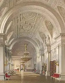 The hall and adjoining rooms formed the suite of the Tsarevich and Tsarevna, and remained their private rooms after their accession in 1855.