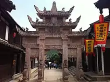 The Qing court disapproved of this practice, and instead regarded widow chastity as the epitome of filial piety and also as a statement of loyalty to the imperial court and government officials.[14][15] To promote this viewpoint the Qing court arranged to confer honors upon a family housing a chaste widow, along with other measures such as the construction of a large and ornate ceremonial arch—"Chastity Paifang" or "Chastity and Filial Paifang" (節孝牌坊)—in the family's community.[14] Widows were also encouraged to adhere to chastity by legal measures: according to Qing era law, a widow could only inherit or act as a custodian of her husband's property if she preserved her sexuality as a statement of "loyalty" to her late husband.[15][14] In culturally dissident regions of the Chinese empire,[14] government officials started "Widow Chastity" crusades to enforce orthodox Chinese culture and eliminate unconventional marriage customs, particularly the levirate marriage, a practice in which a man marries his dead brother's widow in order to continue his blood line.[14]