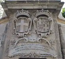 The third and final water inspection tower was built in Floriana, and it became known as the Wignacourt Water Tower. It is located close to Argotti Botanical Gardens and the Sarria Church. It is a round structure supported by pilasters, and it also contains a fountain and a horse trough. The top of the tower contains a sculpted fleur-de-lis, and it is also decorated with the coat of arms of the Order of St. John and the personal arms of Wignacourt.[37] Below the coats of arms is the following inscription:[1][38]