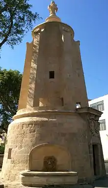 The "first" fountain which was connected to the aqueduct is the Wignacourt Fountain, then located in St. George's Square in Valletta, facing the Grandmaster's Palace. It was officially inaugurated on 21 April 1625, marking the arrival of water in Valletta.[46] This fountain was symbolic of Wignacourt as, similar to the other monuments of the aqueduct, it had a Fleur-des-Lis on top. There is an early 18th century painting of the square with this fountain included.[47] The inauguration ceremony of the aqueduct on 21 April 1615 was held at this fountain.[48] The original fountain was Baroque but less decorated and was ordered to be demolished on 2 January 1745.[49]